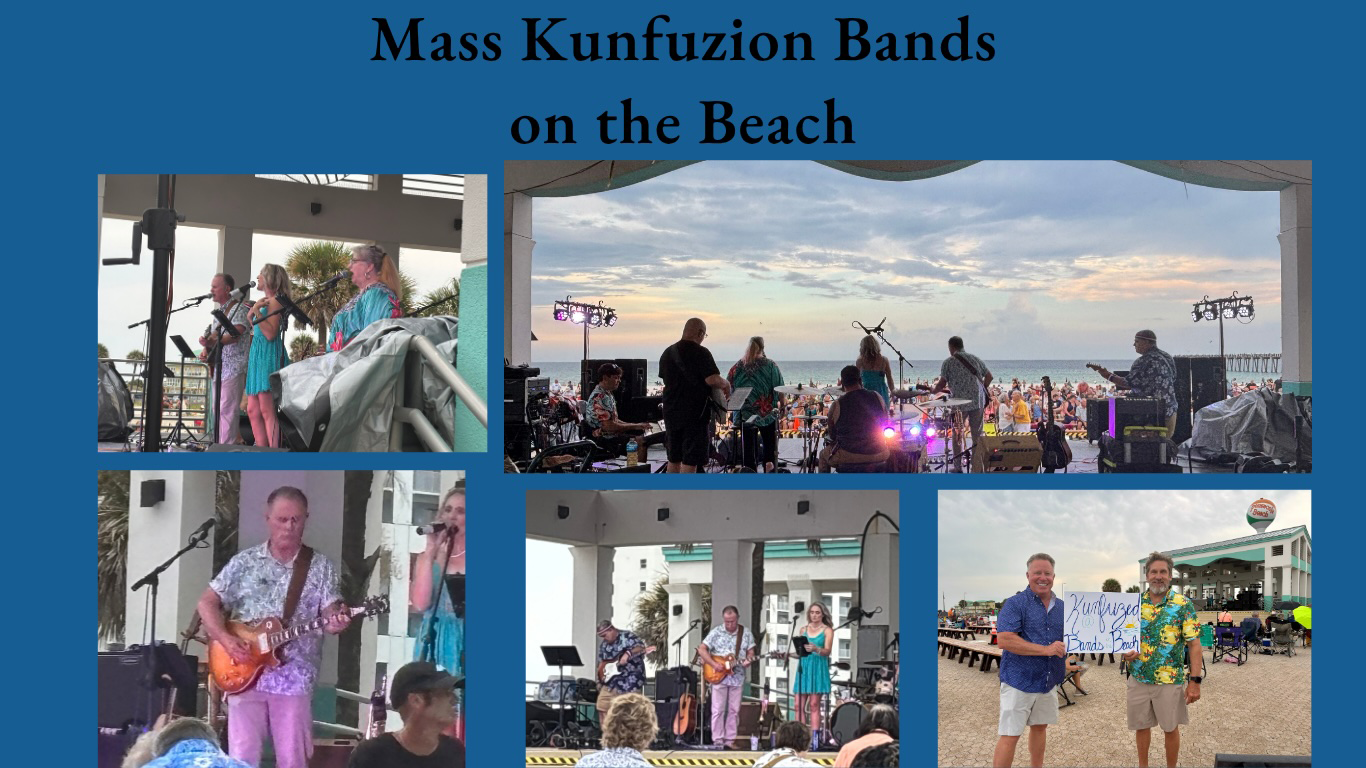 MASS KUNFUZION STEPHEN “PHIN” JONES, GERALD ADCOX, MITZI HOLT, JENNIFER DELGALLO TAYLOR, MIKE VOGEL, STEVE MAPLES, CALEB MACCARTEE, AND JONATHAN CALHOUNEven though the thunderstorm cut us short, we had a great time! Thanks to All for coming out!What a great time we had at the Pensacola Beach Elks Lodge last night!! A great group of people who definitely threw a great party!! As usual, we were Kunfuzed Happy New Year. We hope to see you all in 2025!St. Vincent de Paul Alfred Washburn Gala April 5, 2024THANKS TO ALL WHO CAME OUT FOR BANDS ON THE BEACH! WE HAD A BLAST!